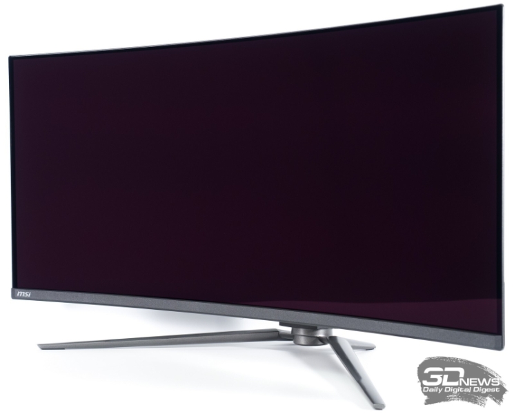 Для своей 34-дюймовой новинки в MSI выбрали обновлённую центральную стойку с плавными закруглениями и Y-образную цельнометаллическую подставку с двумя небольшими выступами сзади для улучшения устойчивости. Получилось эффектно, но достаточно габаритно – в некоторых случаях монитор окажется установлен близко к пользователю. В идеальном варианте требуется рабочий стол глубиной не меньше 80 см.