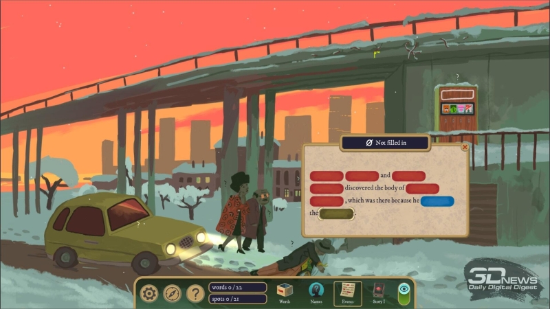 Конечная цель в каждом эпизоде — составить отчёт, в котором вы идеально заполните все пропуски. Например: «____ ____ зашёл в ____ и ударил ____ ____». Хотя слово «ударил» тоже, возможно, придётся вставлять в отчёт самому — тут и имена нужно вручную подбирать, и глаголы, и существительные. Предполагается, что у игрока в голове выстроится цельная картина произошедшего, поэтому помимо отчёта нужно заполнять ещё несколько листов, постоянно меняющихся и делающих каждое дело уникальным.