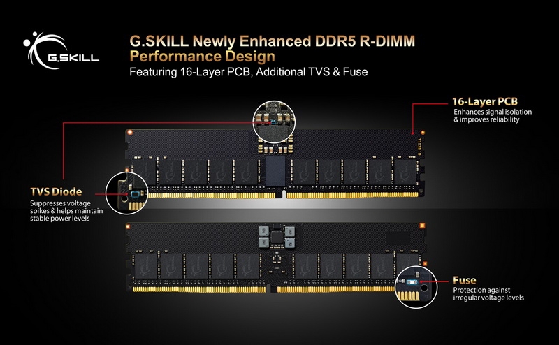 Компания G.Skill представила усовершенствованные модули памяти DDR5 R-DIMM для рабочих станций и серверных систем, соответствующие последней версии стандарта DDR5 R-DIMM от JEDEC. Новые модули производятся с использованием 16-слойных печатных плат для улучшенной целостности сигнала.