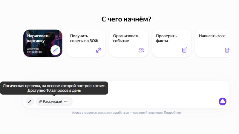 У некоторых пользователей с платной подпиской «Алиса Про» кнопка «Рассуждай» появилась уже два или три дня назад. На кнопке имеется отметка, что функция находится на стадии бета-тестирования. Пользователям предлагается 10 запросов в день.